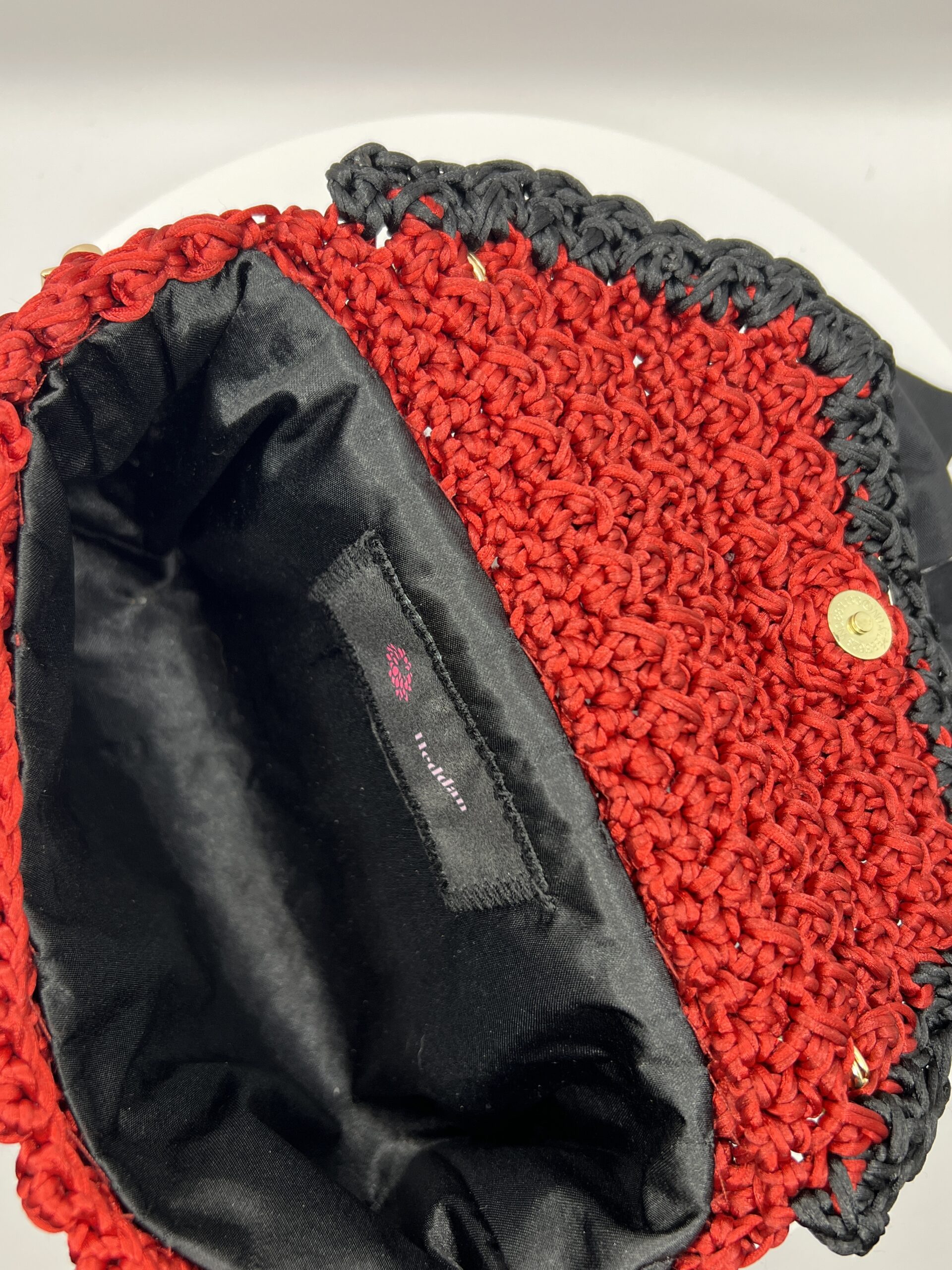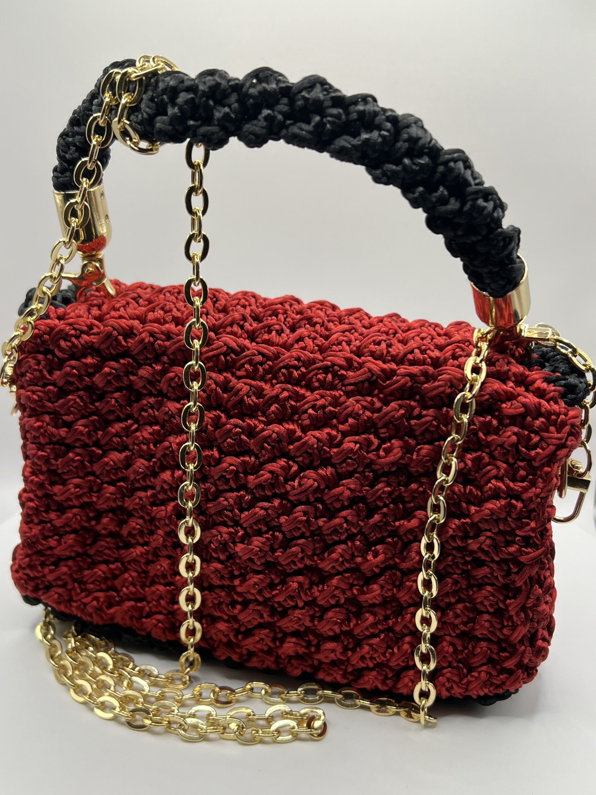 Crimson bag with black lining, velvet bow and golden bag chain.