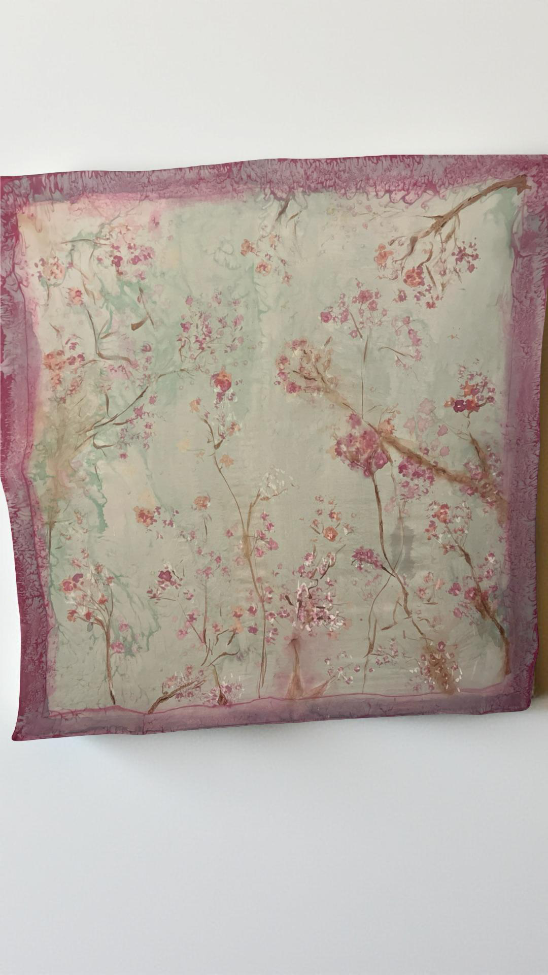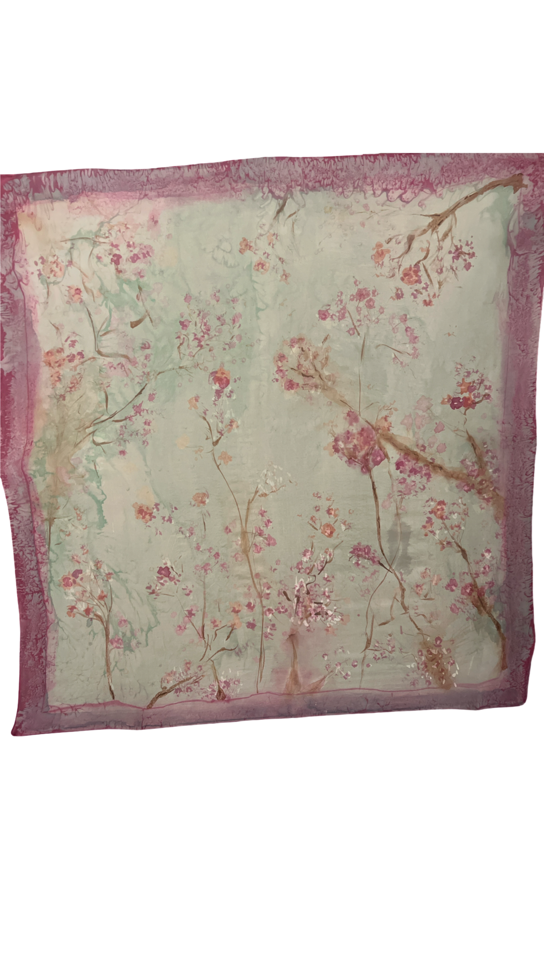 Blossom Drift is a hand painted silk piece inspired by that brief, weightless moment when spring is in full bloom and the petals seem to move with the light. Soft pinks and muted greens float across the fabric, with delicate branches and blossoms appearing almost like they’ve been remembered rather than painted. The border carries a deeper rose tone, framing the scarf like a page from a favourite book. There is movement in the colour, but also a calmness, as if the whole scene has exhaled.