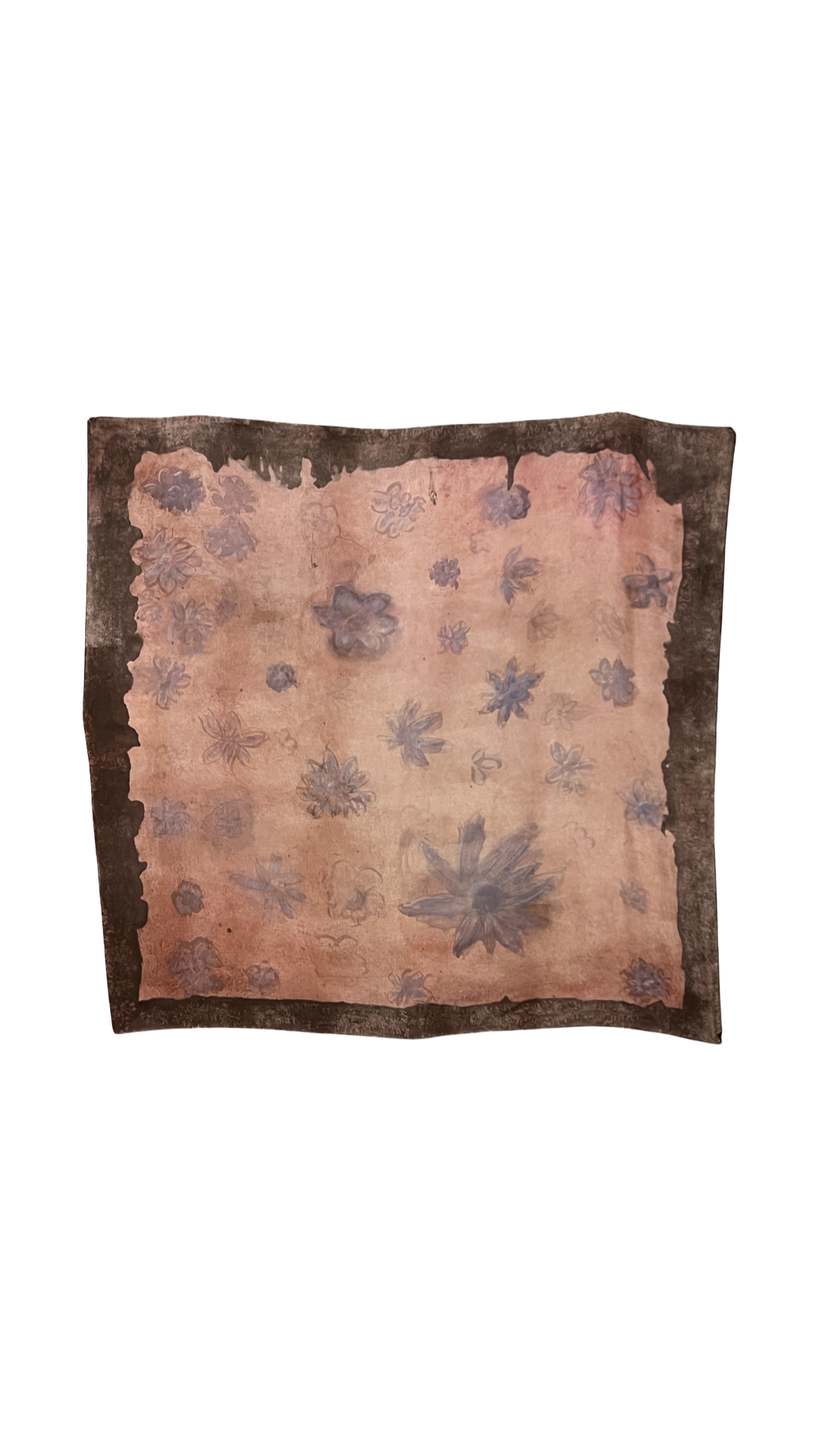 A hand painted silk scarf with a quiet, time worn softness. The cplours settle somewhere between tea stain and faded lavender, with small floral shapes drifting across the surface as if they have been remembered rather than drawn. The darker border gives it a frame, lika a page from an old notebook that has been kept and loved. Made slowly. Meant to be worn gently.