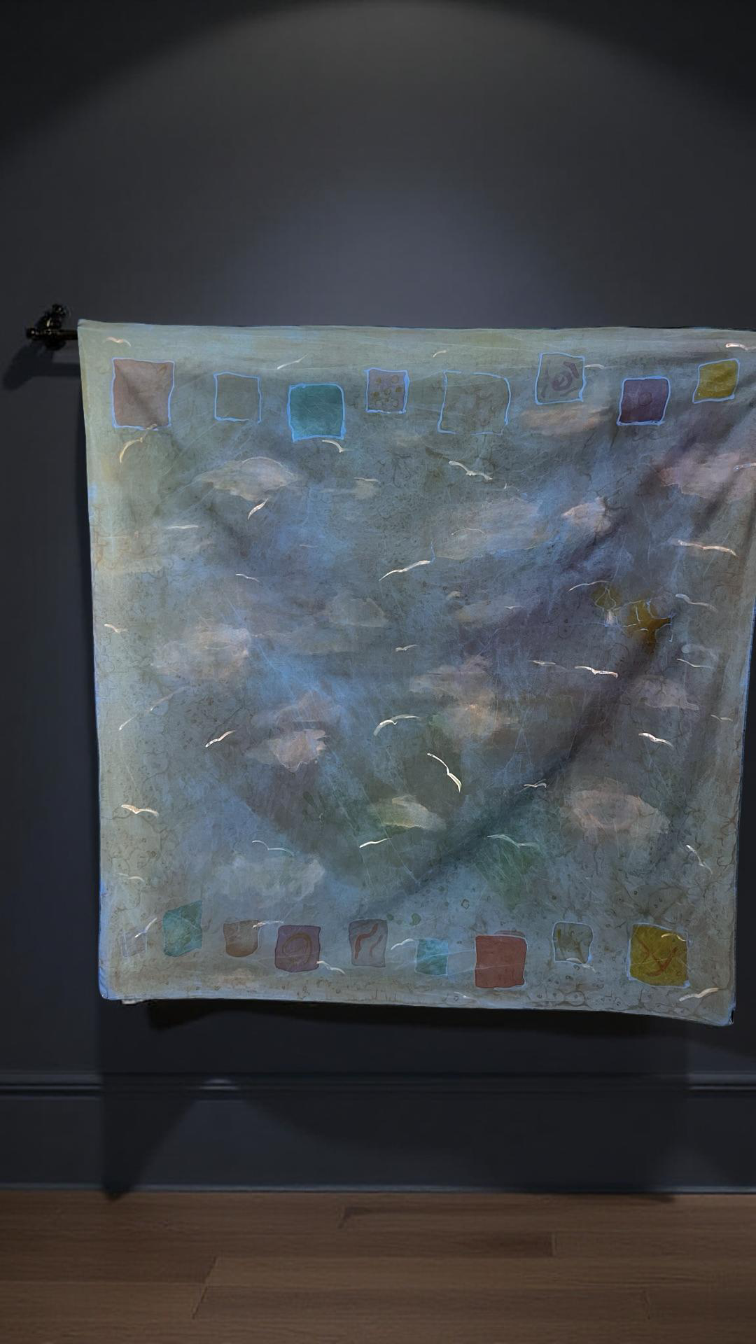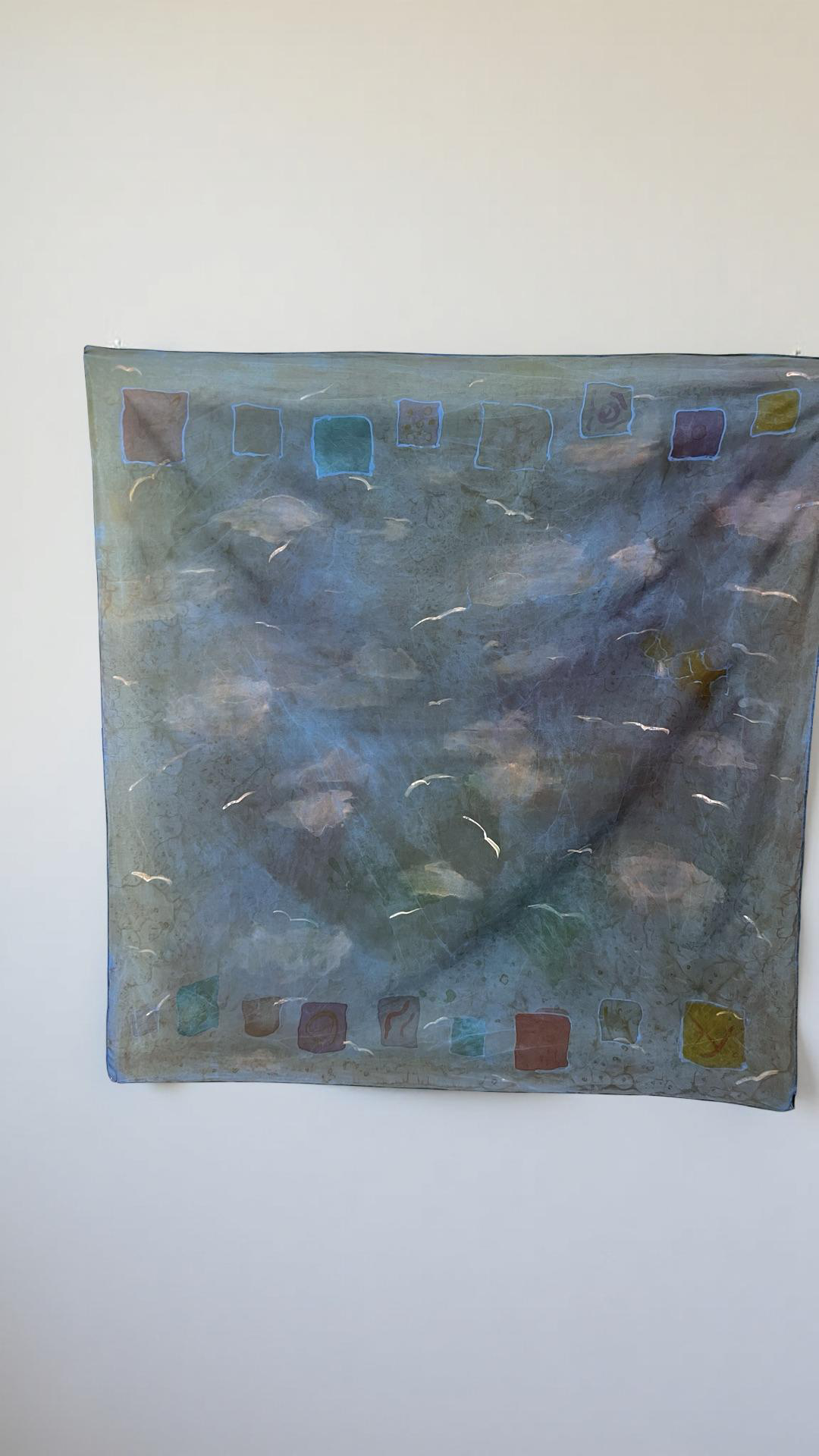 Gulls in the Sky is a hand painted silk piece inspired by the quiet movement of birds crossing a wide, open sky. Soft layers of blue, teal and muted earth tones drift across the fabric like shifting light in the atmosphere, while pale, sweeping strokes suggest gulls gliding freely in the air.