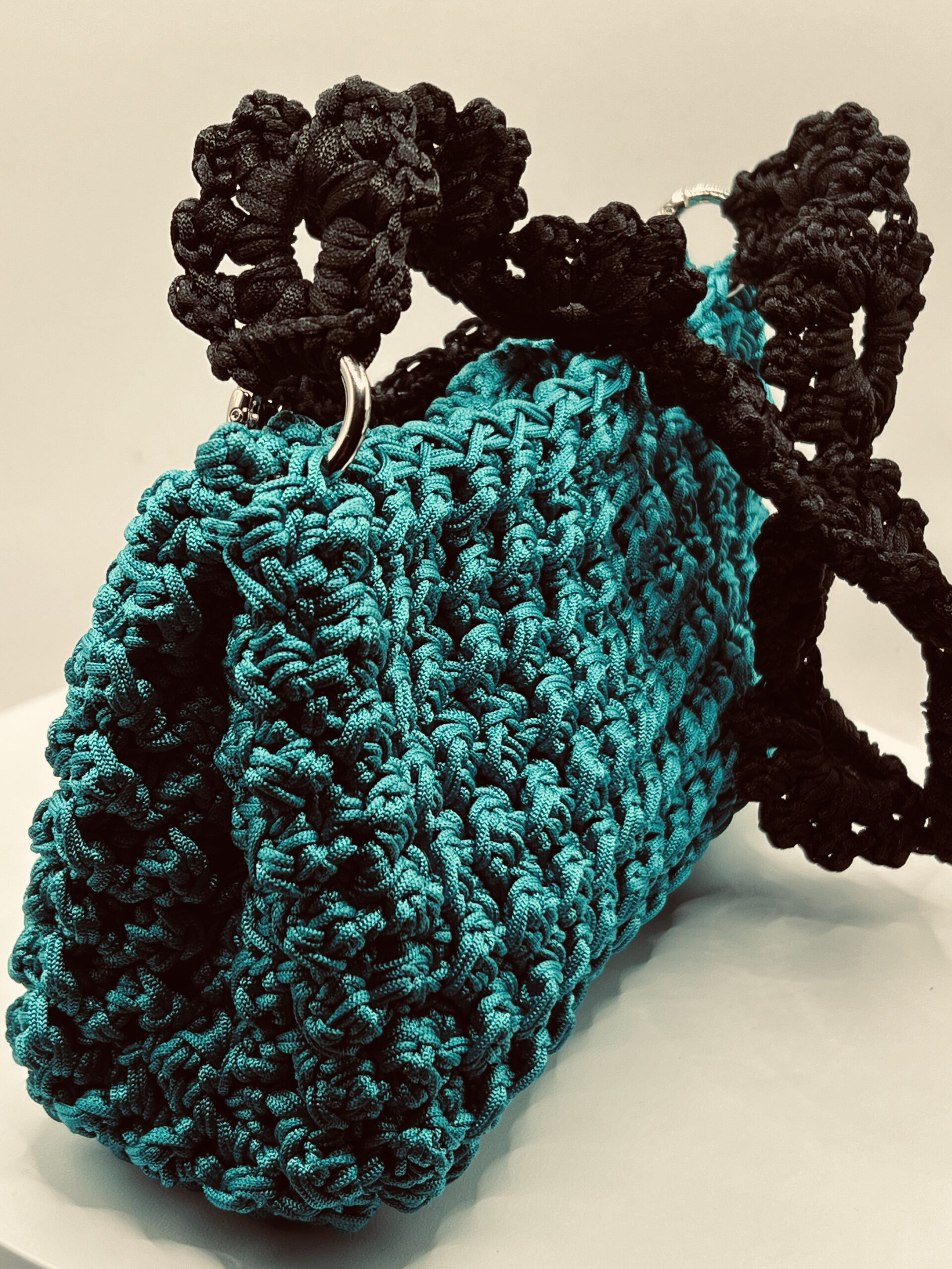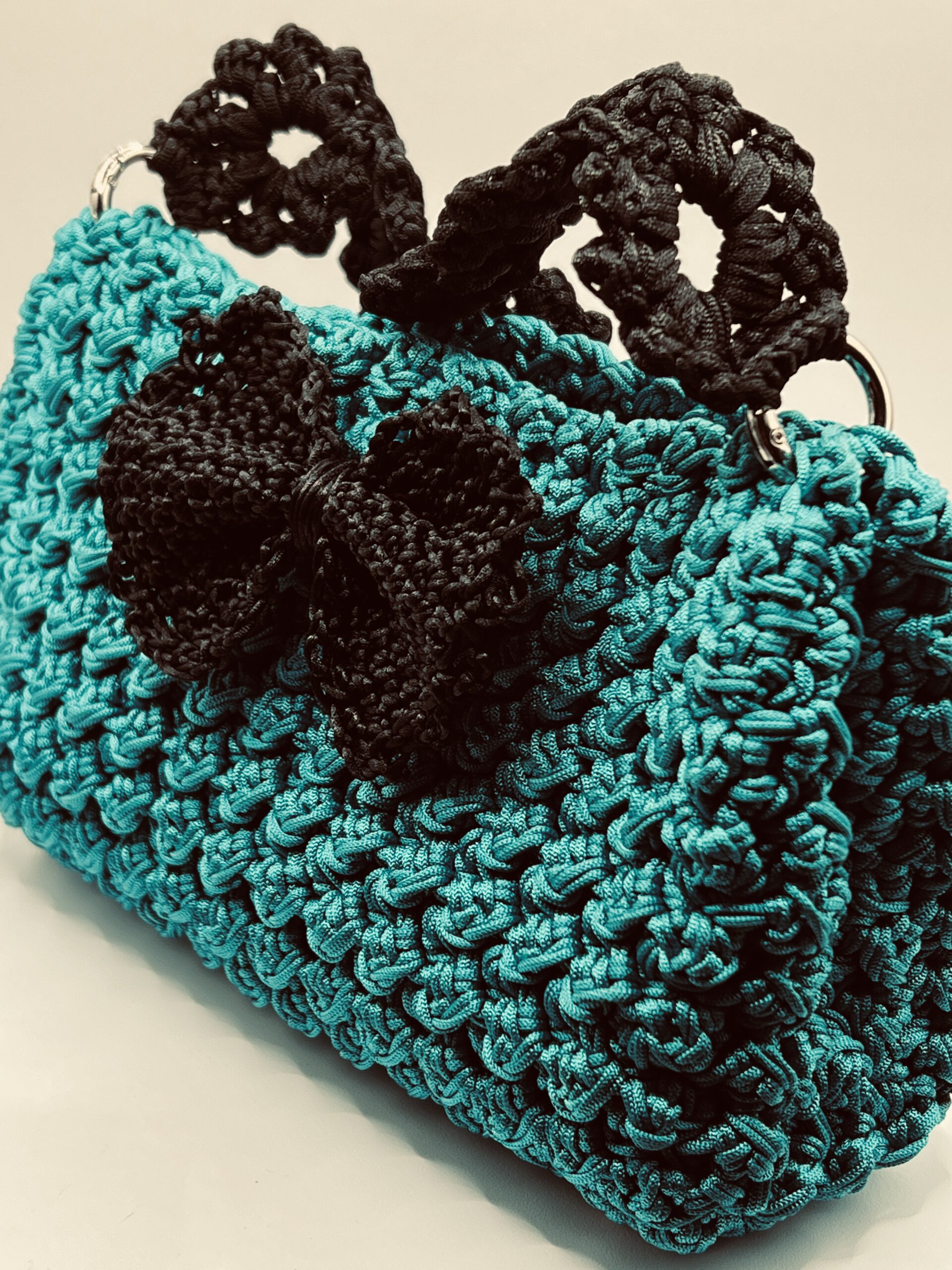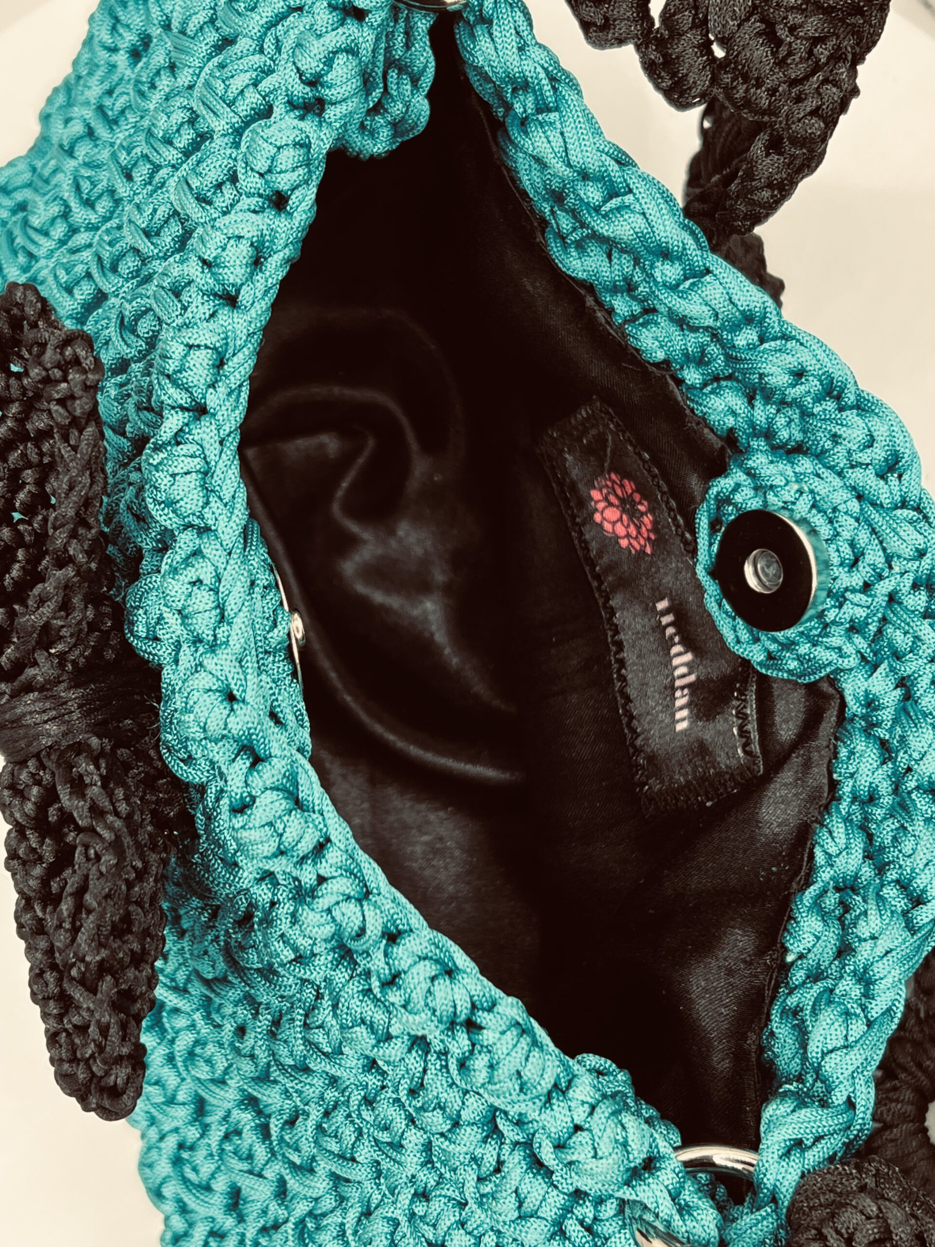 Emerald green with black lining and a zipped pocket. Black bow and black handle.