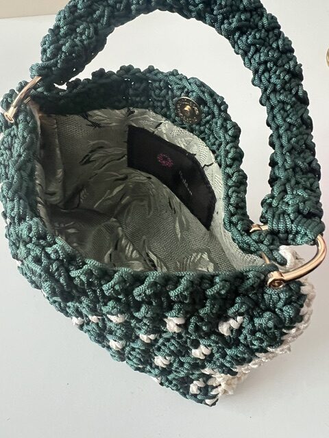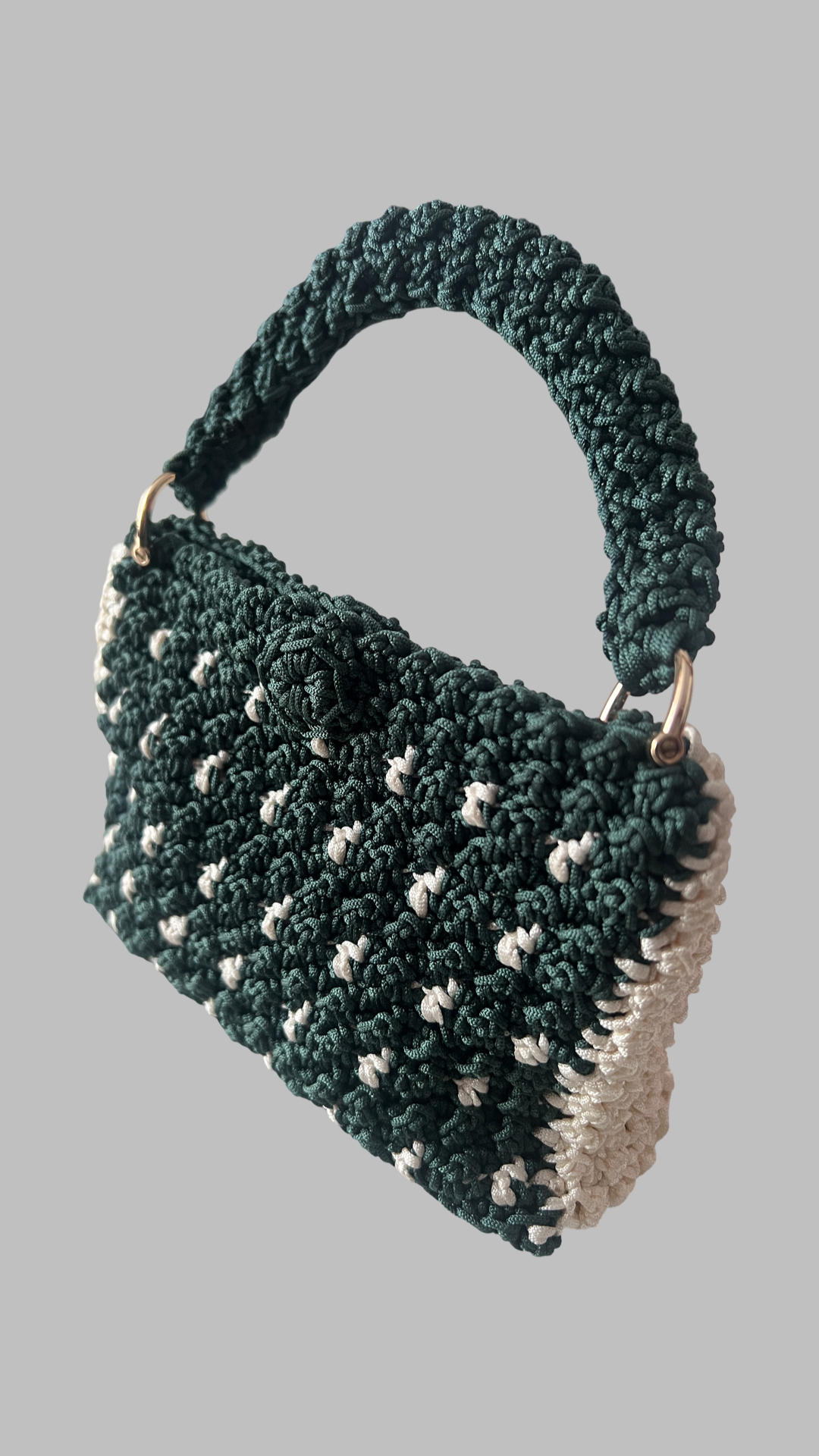 Miss Louise is a hand crocheted handbag in deep forest green with soft ivory accents woven through the surface like tiny stitched stars. The shape is classic and compact, but the texture gives her personality, structured and quietly confident.