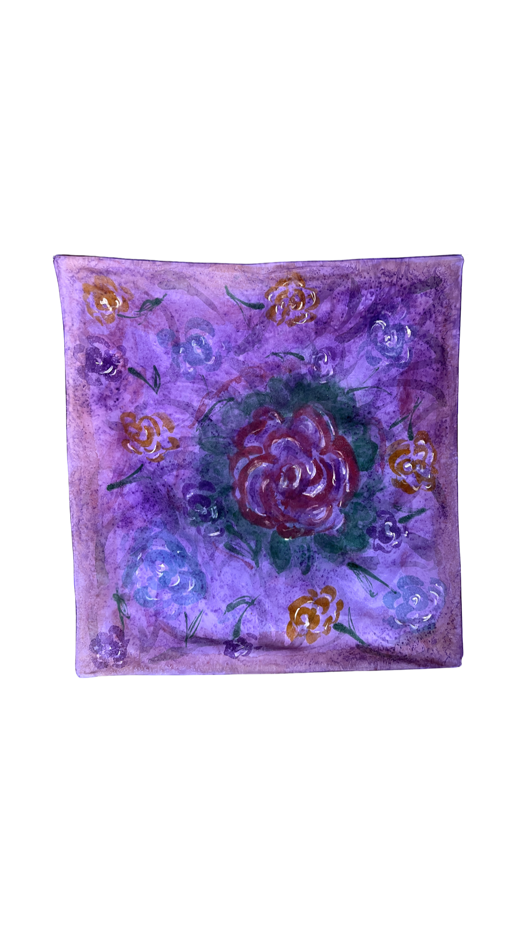 This hand painted silk scarf features a poetic floral motif in layered purple and violet shades, with soft accents of orange and green. The design is painted by hand, giving the scarf an artistic and slightly whimsical character rather than a factory perfect look.